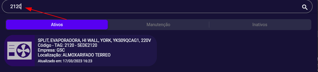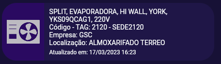 Traz a lista de equipamentos cadastrados de acordo com a situação selecionada. Você pode tocar ou clicar sobre o equipamento para ver mais detalhes do mesmo. São mostradas as seguintes informações: