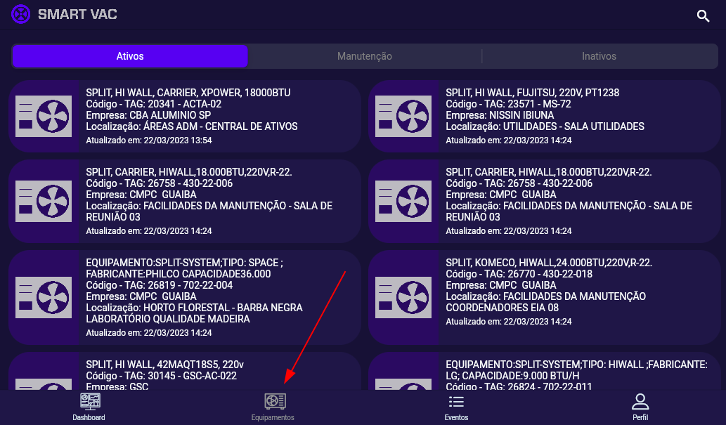 A tela com a listagem de equipamentos cadastrados pode ser acessada tocando no segundo ícone da barra inferior conforme indicado na imagem abaixo.