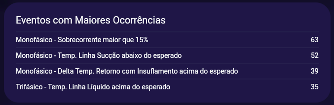 Relacionado ao item anterior, aqui são trazidos os eventos com maiores ocorrências nos últimos 7 dias, facilitando a identificação dos maiores problemas ou mesmo algo que possa estar afetando uma grande quantidade de máquinas, como problemas de energia.