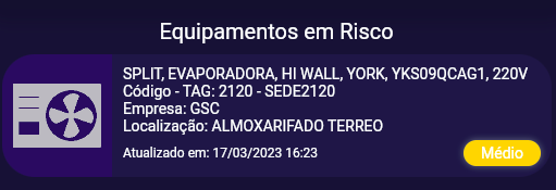 Relacionado ao primeiro item, este elementos traz quais os equipamentos estão em risco bem como a criticidade deste risco. Você pode tocar neste elemento para abrir o detalhamento do equipamento.