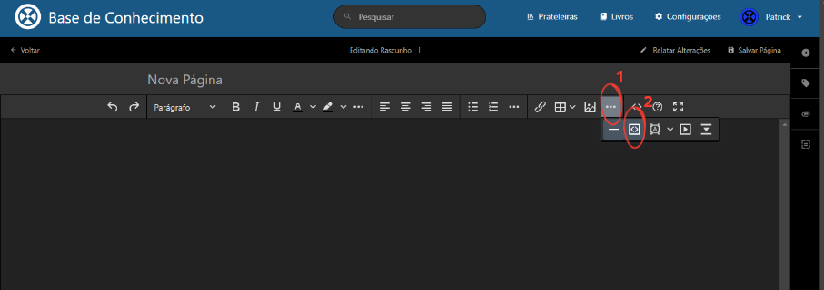 - Para criar uma página para armazenar código, clique em "Nova Página" no canto esquerdo. Feito isso, você verá o seguinte: